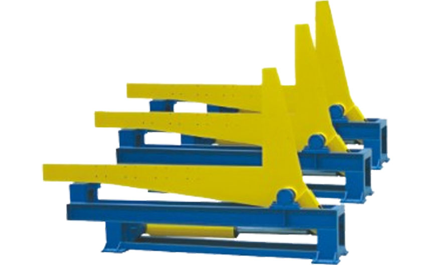 90度翻轉(zhuǎn)支架是重鋼線組立機(jī)的配套設(shè)備,一般配置為一組3臺(tái),主要用于將H型鋼從立式擺放經(jīng)過(guò)90度翻轉(zhuǎn)后成臥式擺放,以便輸入下道工序進(jìn)行焊接。它采用液壓缸推動(dòng)動(dòng)L型轉(zhuǎn)臂轉(zhuǎn)動(dòng),由于液壓站配置了同步閥,使得3臺(tái)90度翻轉(zhuǎn)支架可以同步翻轉(zhuǎn)。